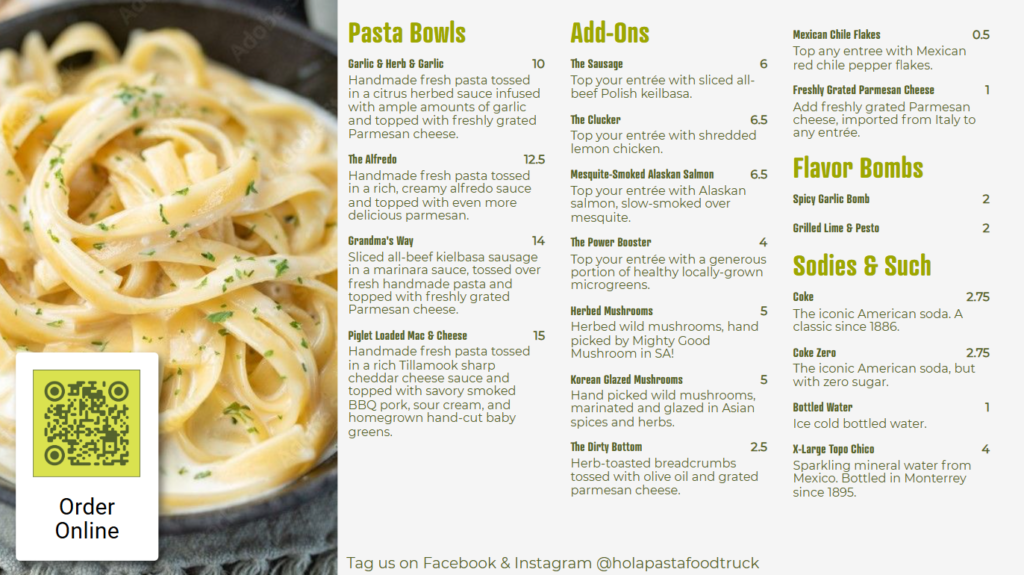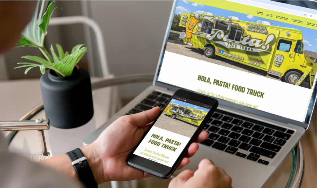 A sleek, mobile-friendly website was essential to Hola, Pasta! Food Truck’s success. We designed a user-friendly site featuring the menu, truck location updates, and a seamless online ordering system. Optimized for search engine ranking with local SEO, the website serves as a digital extension of the brand. We also included social media sharing links, making it easy for customers to find and connect with the truck.