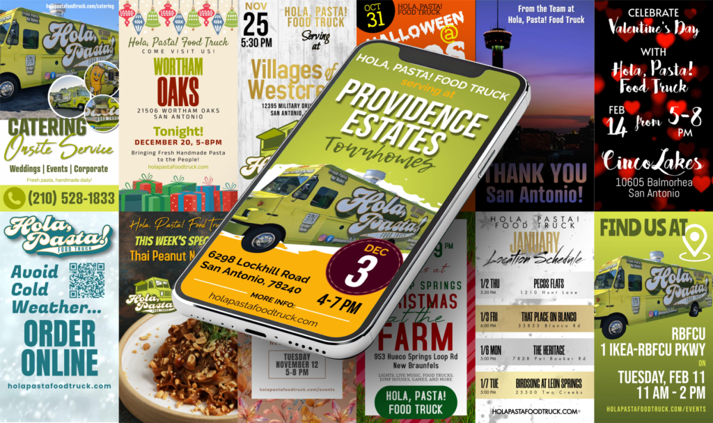 To build excitement and customer engagement, we developed a strong digital presence for Hola, Pasta! Food Truck across social media platforms. Custom graphics, engaging content, and promotional strategies helped showcase the truck’s fresh menu, locations, inspirations, and customer interactions. Additionally, we designed marketing materials like gift cards and thank you cards to encourage repeat business and word-of-mouth buzz.